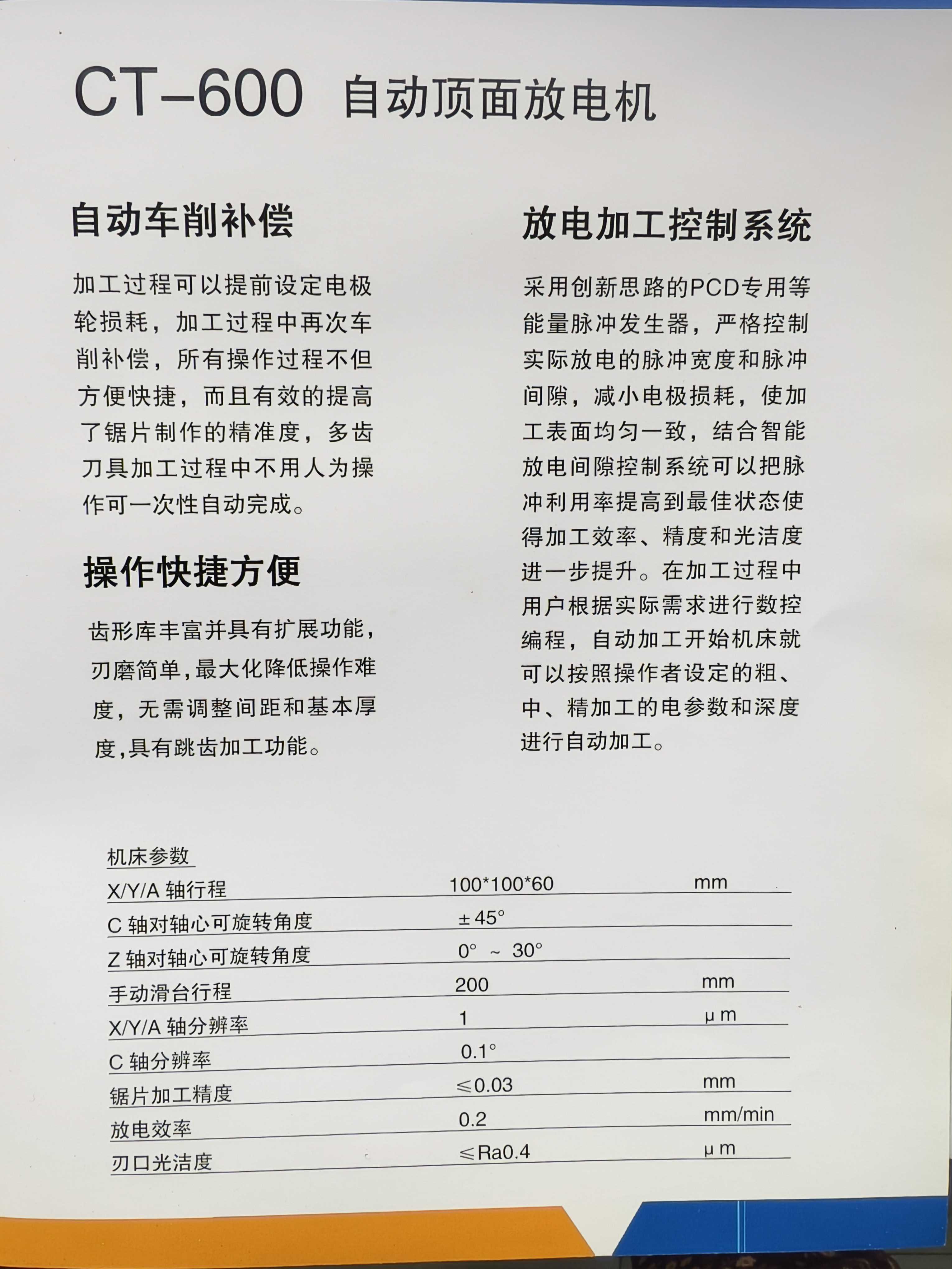 采用创新思路的PCD专用等能量脉冲发生器,严格控制实际放电的脉冲宽度和脉冲间隙,减小电极损耗,使加工表面均匀一致,结合智能放电间隙控制系统可以把脉冲利用率提高到最佳状态,使加工效率、精度和光洁度进一步提升。在加工过程中用户根据实际需求进行数控编。自动加工开始,机床就可以按照操作者设定的粗、中、精加工的电参数和深度进行自动加工。
